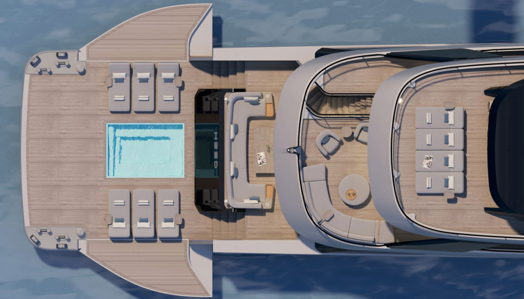The bow lounge aboard Heed is conceived as a secluded retreat, centred around a private pool and uninterrupted views forward. Positioned away from the main social areas, it offers a calm, exclusive environment where time slows naturally. The pool becomes the focal point of the space, inviting relaxed swims and quiet moments at anchor, while surrounding sunpads and seating provide comfort throughout the day. With open sightlines to the horizon and a strong sense of privacy, the bow lounge reflects Heed’s owner-focused design philosophy, refined, serene, and deeply connected to the sea.