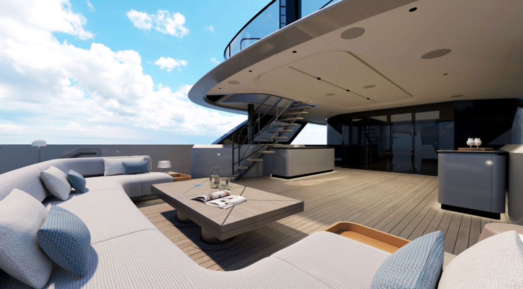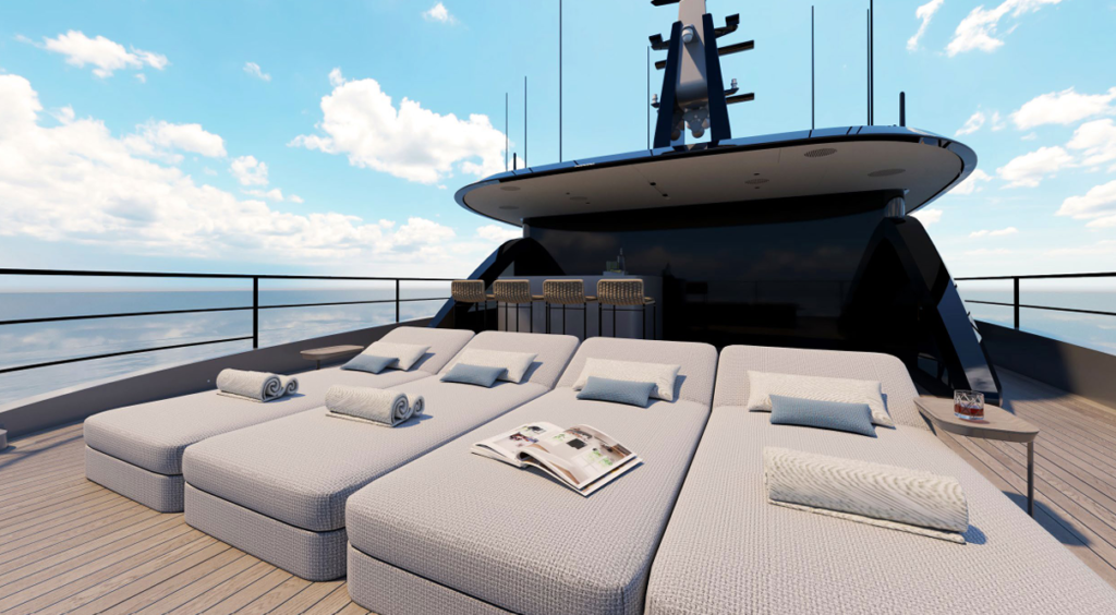 Heed’s sundeck is designed as an open, elevated space where time is measured by light, views, and the movement of the sea. Generous lounging areas invite long afternoons in the sun, while flexible seating allows the space to adapt easily from quiet relaxation to informal gatherings. Positioned high above the water, it offers sweeping panoramic views and a strong sense of privacy, making it an ideal setting for sunrise mornings or evenings spent watching the horizon change. Uncomplicated and spacious, the sundeck embodies Heed’s approach to outdoor living, relaxed, intuitive, and quietly refined.